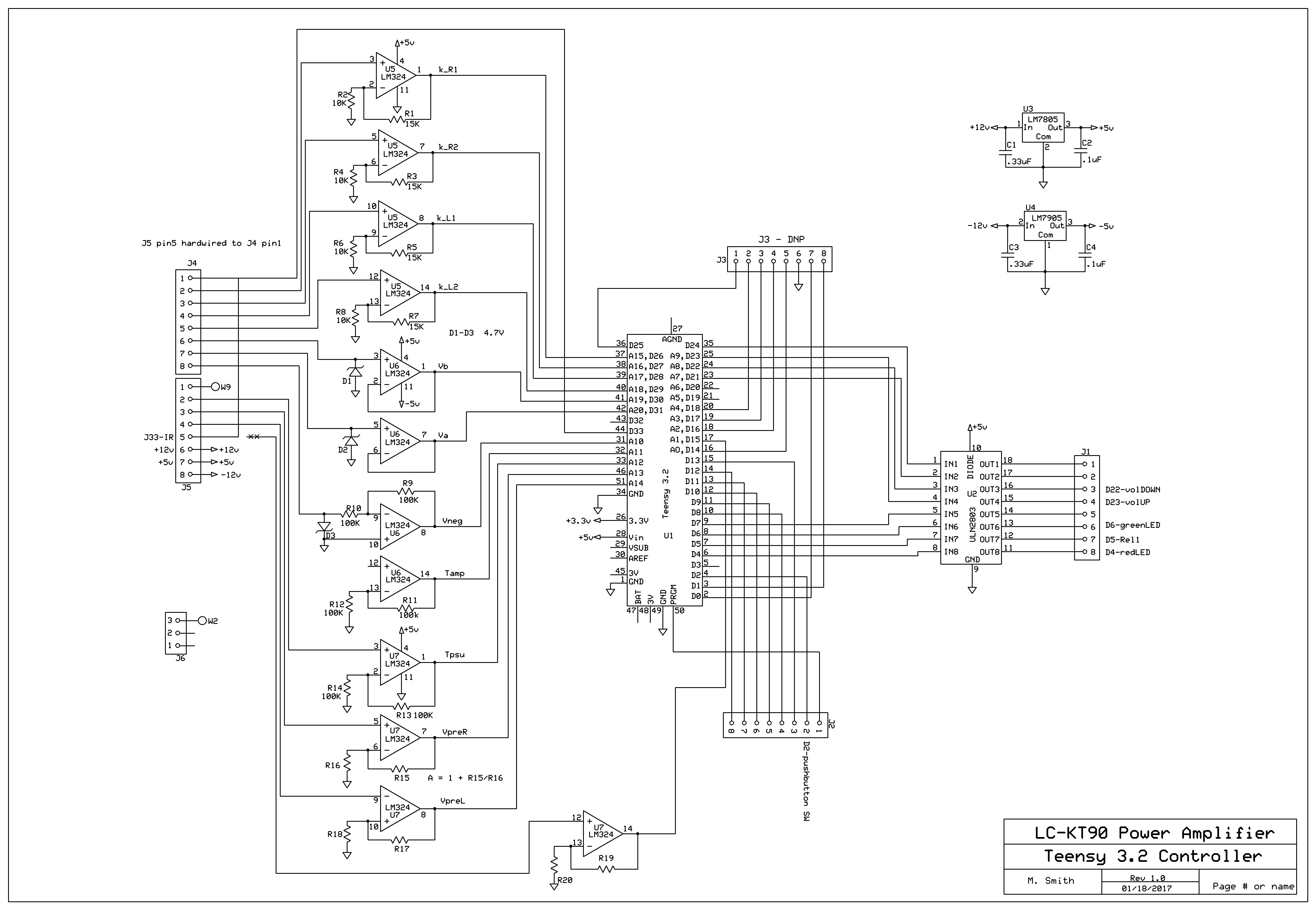 I designed an all-purpose PCB to accomodate the Teensie 3.2 with 16 inputs running through op amps and 8 buffered outputs. This was used in all its glory in the Unnecessarily Complicated 6550 Power Amp. For the Less Complicated Amplifier, only one input was used (from the IR remote) and only 5 outputs were use, 3 to control the soft-start relays and LED's, and two to control the volume. This is shown below.