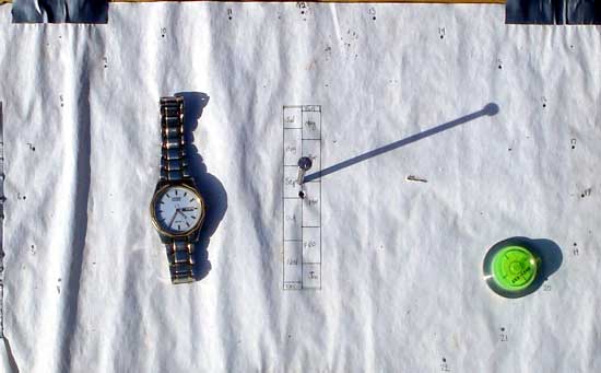 Using my Smithlabs handy-dandy "Design Your Own Sundial" link above, I came up with this somewhat ragged prototype. This photo was taken in April with daylight savings time in effect. The clock shows a little after 15:30, one hour behind the watch, because of daylight savings time. The clock could very well be designed to show the correct time during DST months, since these months are the only time you would probably ever use the clock.