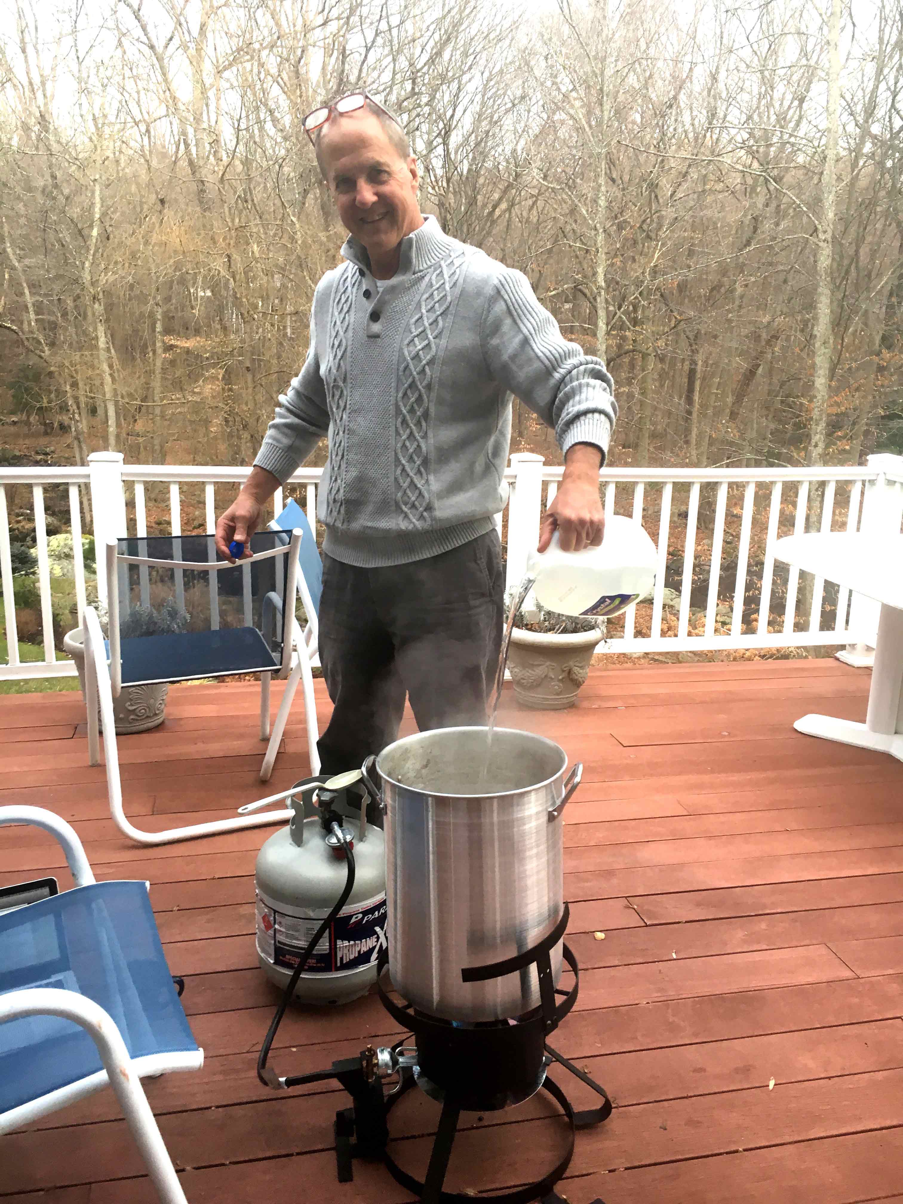 Yours Truly adding a gallon of sap to the boil. Note that the sap looks just like water. In fact, it is 99% water, considering that it takes 40 gallons of sap to make one gallon of maple syrup.
